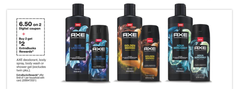 – (1) $6.50/2 AXE deodorant, body spray, body wash or shower gel CVS e-coupo