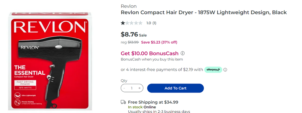 Revlon Compact Hair Dryer – 1875W Lightweight Desig, Black is on sale at Rite Aid for $8.29 and when you buy this you get a $10.00 Bonus Cash making the final price of this FREE. Choose in store pick up for free or have it shipped for free after you spend $34.99. There are other dryers part of this deal priced at $113.00-$14.00 if you are not fond of this one.