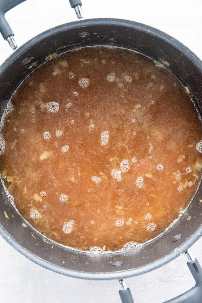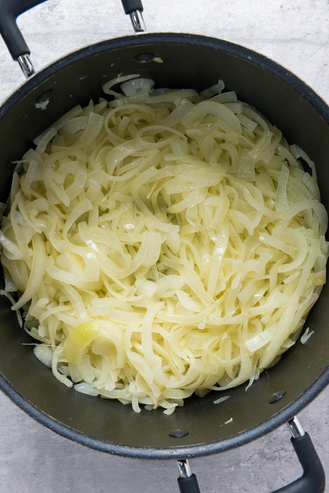 • Caramelize the Onions: In a large pot or Dutch oven, melt the butter with the olive oil over medium heat. Add the sliced onions and stir to coat them with the butter mixture. Cook for about 15 minutes, stirring frequently, until the onions start to soften and turn translucent.