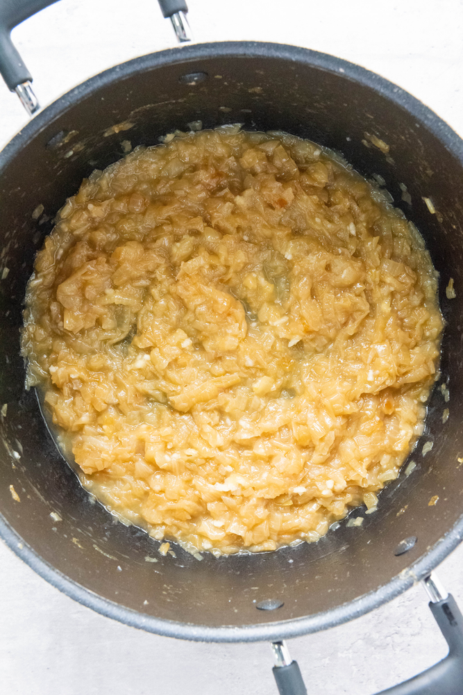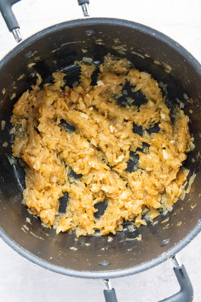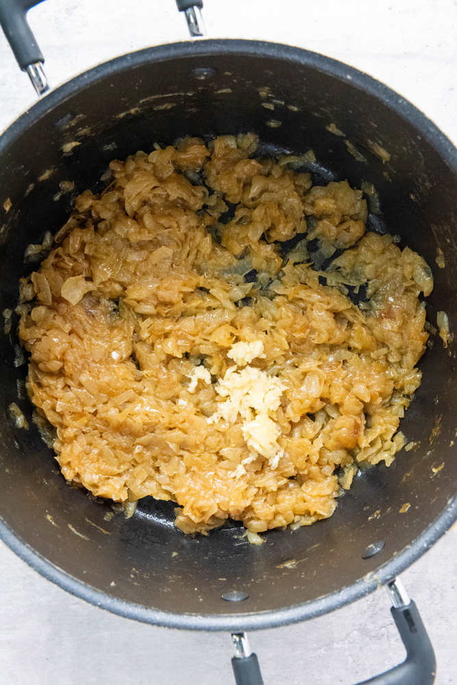 • Reduce the heat to medium-low and continue cooking, stirring occasionally, for about 30-40 minutes, or until the onions are deeply caramelized to a rich golden brown color. Add the garlic in the last few minutes of cooking, being careful not to let it burn.