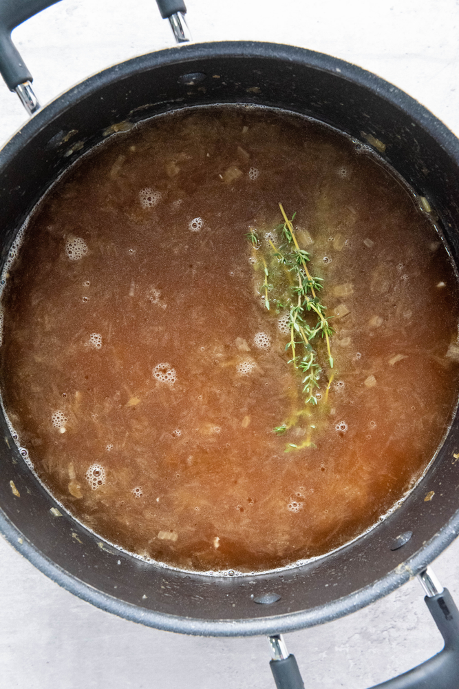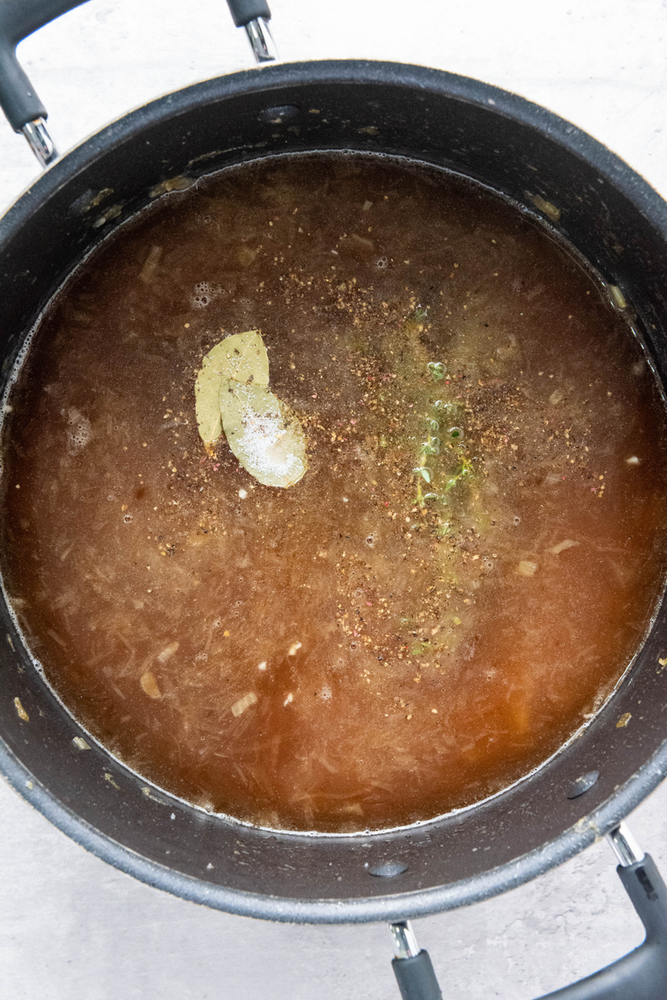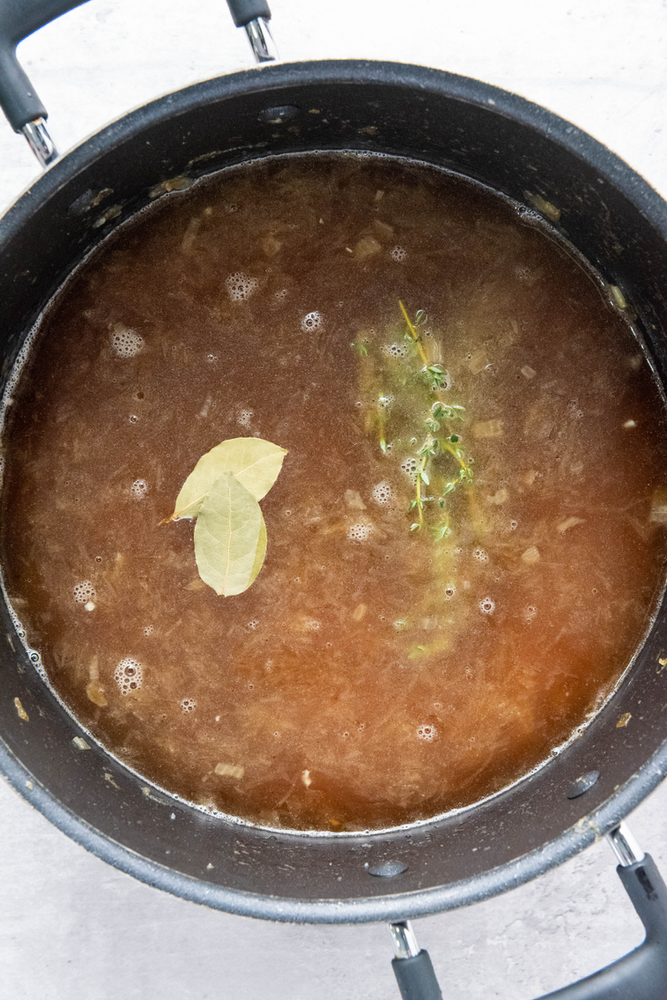 • Add the beef stock, bay leaves, and thyme. Season with salt and pepper. Bring the mixture to a simmer, then reduce the heat to low and let it gently simmer for about 30 minutes. This will allow the flavors to meld together. Remove the bay leaves before serving.