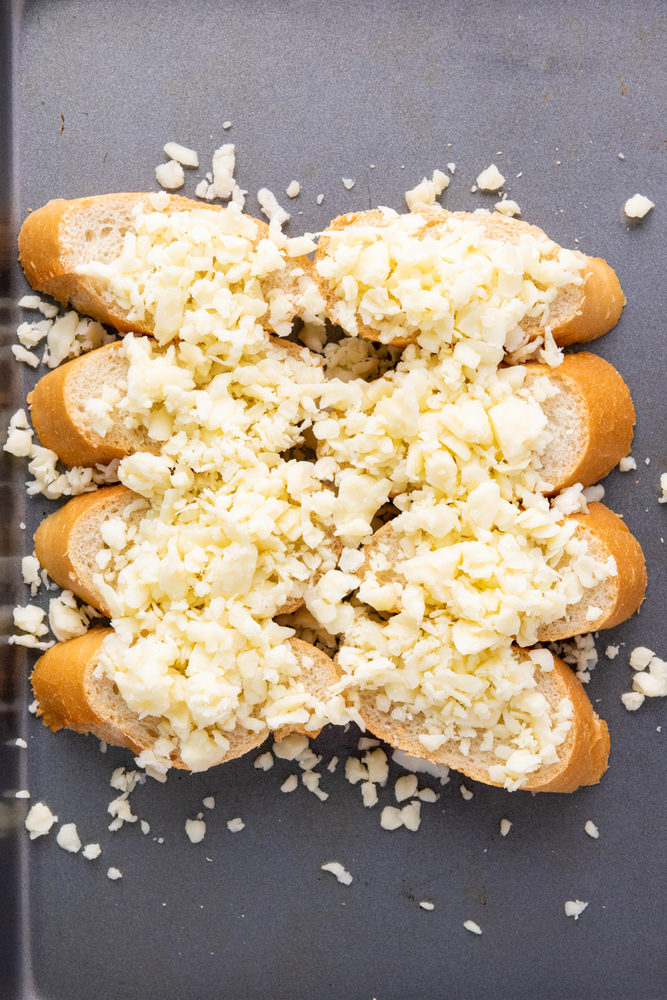 • Broil the Cheese: Preheat your broiler. Place the baguette slices on a baking sheet, top with grated cheese and broil them in the preheated oven until the cheese is bubbly and golden brown, about 2-3 minutes. Watch carefully to prevent burning.