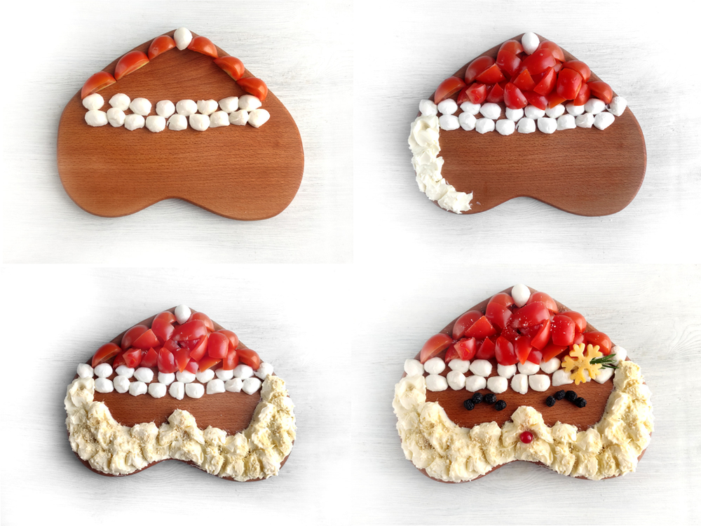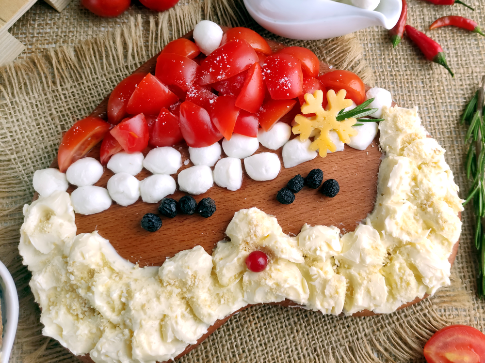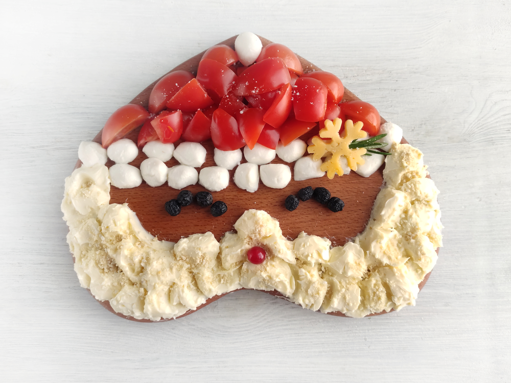 4. Decorate the cap with snowflakes and rosemary. Drizzle the tomatoes with olive oil and sprinkle with salt. Your Santa is ready! The board can be placed in the center of a festive table, topped with swooshing whole-wheat bread or tortillas.