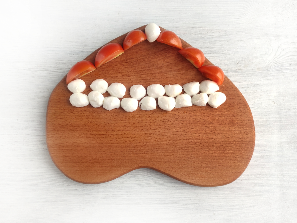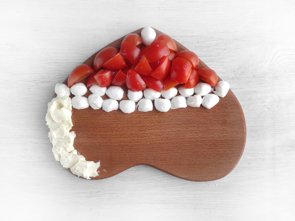 1. Turn the heart-shaped board over. You can also use a regular board or tray. Place the heart-shaped parchment paper on it. Cut some of the cherries into quarters and arrange them around the perimeter of the future Santa hat. Cut the mini mozzarella in half and arrange in place of the ponpon and puffs.
