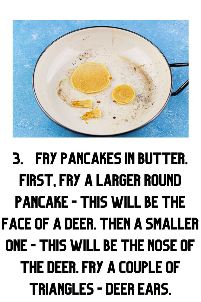 3.    Fry pancakes in butter. First, fry a larger round pancake – this will be the face of a deer. Then a smaller one – this will be the nose of the deer. Fry a couple of triangles – deer ears.