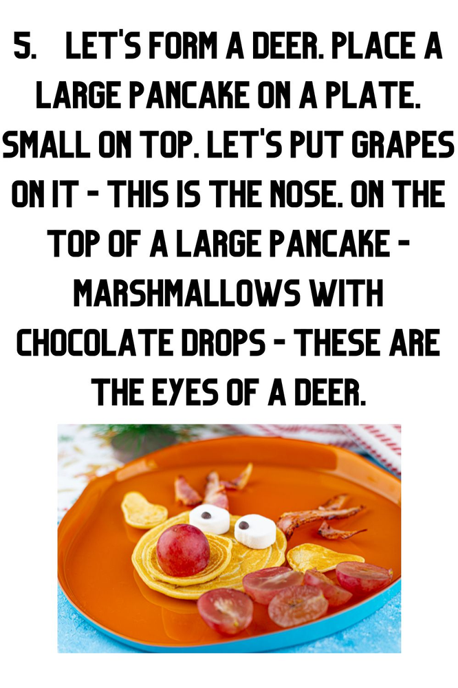 5.    Let's form a deer. Place a large pancake on a plate. Small on top. Let's put grapes on it – this is the nose. On the top of a large pancake – marshmallows with chocolate drops – these are the eyes of a deer.