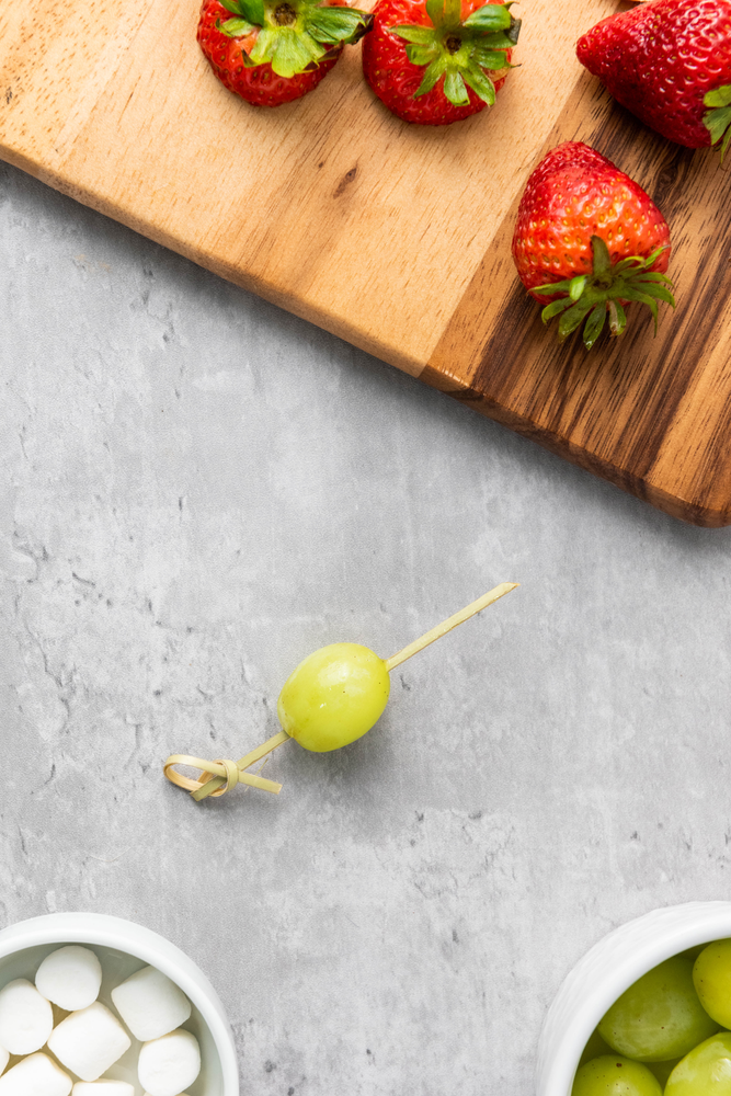 Start by threading a green grape onto each toothpick or small skewer. This will be the Grinch's head.