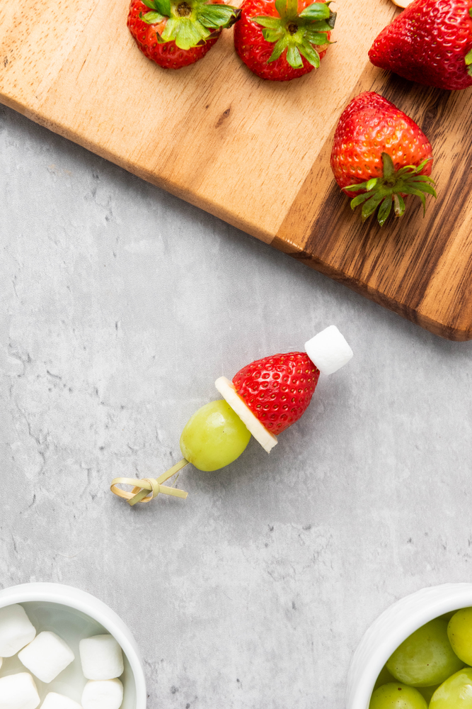 Finish off the kabob by adding a mini marshmallow to the tip of the strawberry for the pom-pom on the Santa hat.