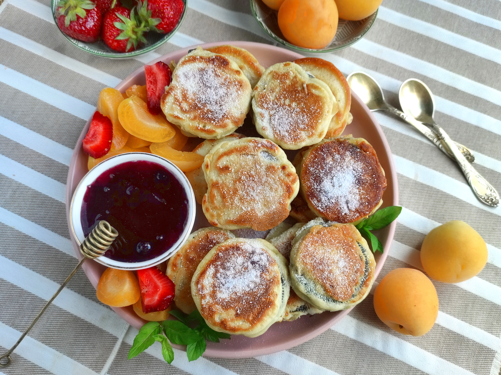 Place pancakes with Oreo on a plate to serve. Top with fruit berries and mint leaves. Sprinkle with powdered sugar.