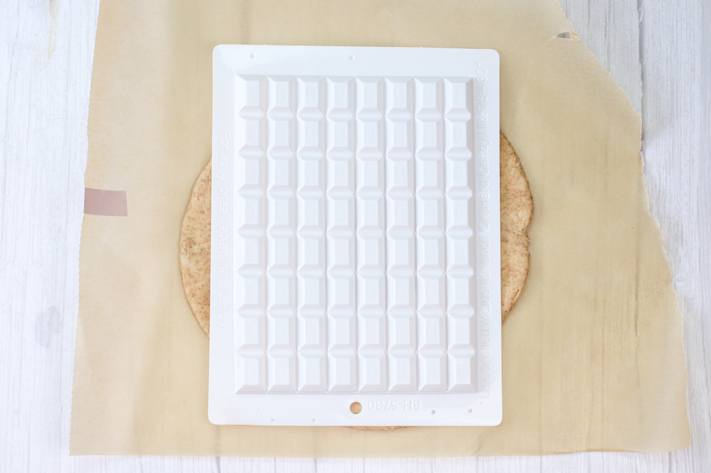 Place the candy mold on top of the dough and flip it over. Roll over the dough with the rolling pin so the dough will get into the cavities of the mold.