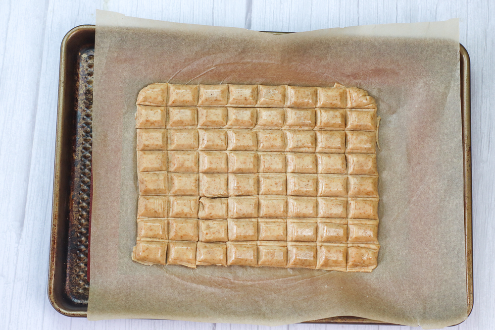 Flip it back over and lift the mold off the dough. Trim the excess and bake for 30 minutes or until firm.
