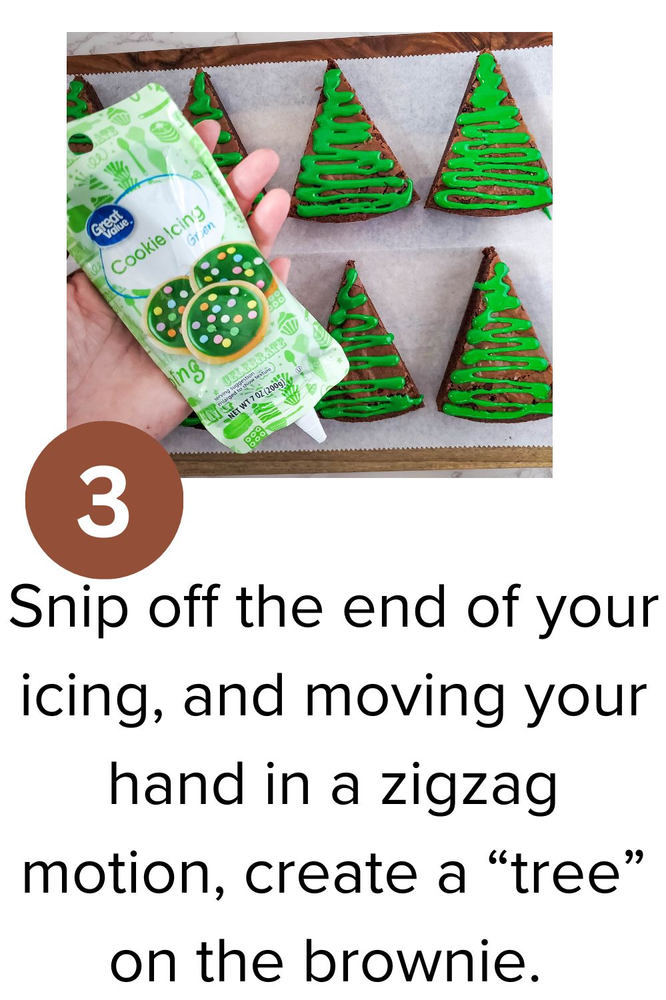 Snip off the end of your icing, and moving your hand in a zigzag motion, create a “tree” on the brownie.