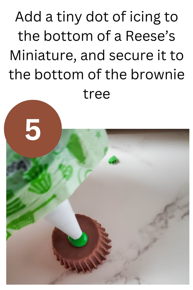 Add a tiny dot of icing to the bottom of a Reese’s Miniature, and secure it to the bottom of the brownie tree.