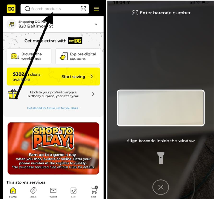 How do I scan in the app to find prices? Open up your Dollar General app then click search products and click on the barcode icon to scan your product. Then scan the product barcode.
