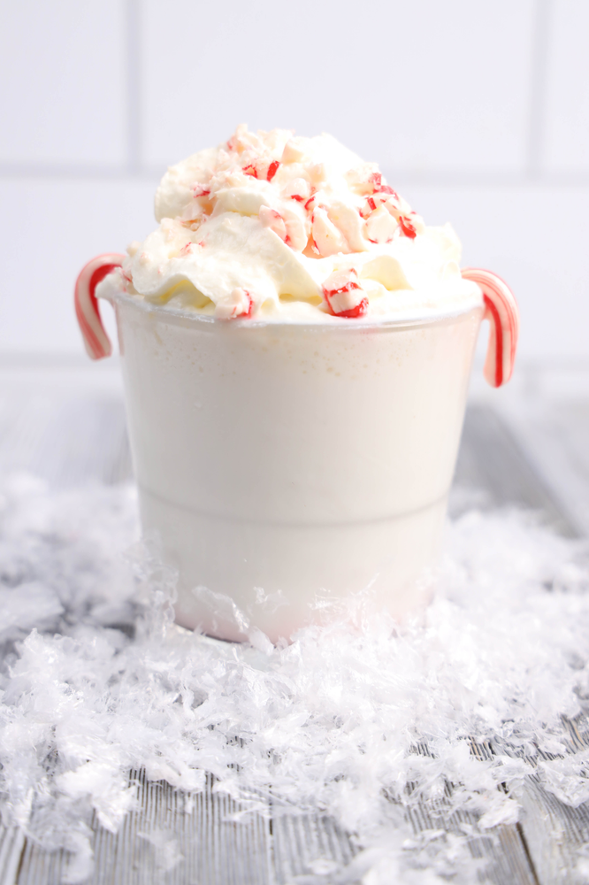 Pour into a glass and top with whipped topping. Crush one small round peppermint and sprinkle over the top. Add the mini candy canes to the sides.