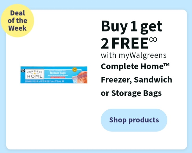 Buy 3 – Complete Home Food Storage Bags (snack, sandwich, quart or gallon), regularly $3.29, on sale $2.79 AND BUY 1 GET 2 FREE!!