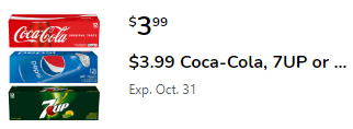 Coca-Cola, Dr Pepper or Pepsi; 12-15 Pack, 12 fl oz Cans $3.99 CARD & DIGITAL COUPON