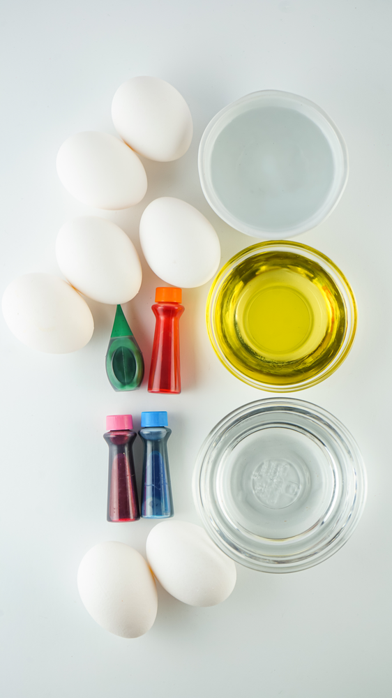 You’ll need one bowl per color you would like to use. I used the cheap cereal bowls from Walmart because they’re cheap and the perfect size. You don’t want the water to be over half an inch because you don’t want the egg to get fully submerged when dropped in.
