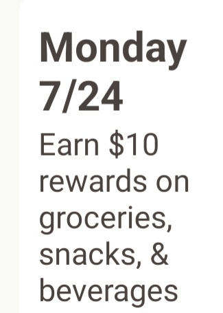 Monday 07/24 earn $10 rewards when you spend $20+ on groceries, snacks and beverages.