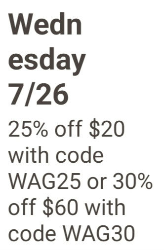 Wednesday 07/26 take an extra 25% off $20 with code WAG25 or an extra 30% off $60 with code WAG30 + FREE 1-hour delivery with code DELIVERY20