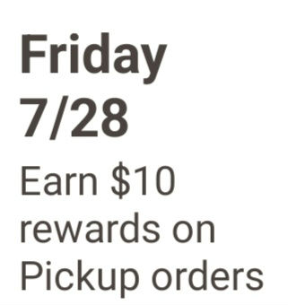 Friday 07/28 earn $10 rewards on a $10+ completed pickup order.
