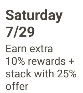 Saturday 07/28 earn an extra 10% rewards plus stack with the 25% rewards offer.