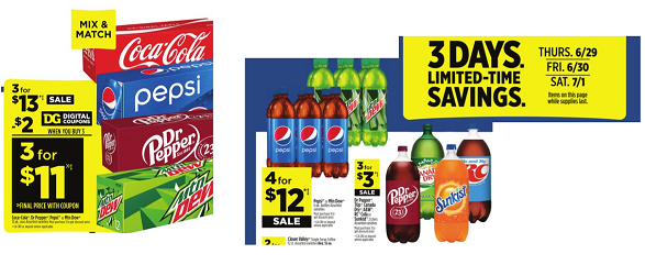 Pepsi and Mountain Dew Bottles are 4 for $12.00 06/29-07/01 (three day sale)