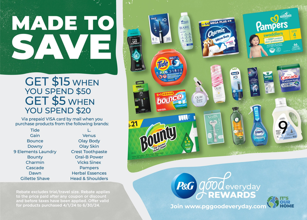 Are you looking to save big on your household essentials? Look no further than the P&G Made to Save rebate! With this amazing deal, you can get back a $5.00 Visa Card when you spend $20.00 or a $15.00 Visa Gift Card when you spend $50.00. And the best part? This is a spend out of pocket deal, so you have to reach that threshold after using coupons! Don't miss out on this opportunity to stock up and save with P&G products. SIGN UP HERE or by clicking the box below that says sign up and start saving.