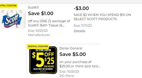 This can be done at Dollar General on Saturday 10/21 using your $5/$25 Saturday Coupon and the $3.00 instant savings on Scott. You have to follow this scenario directly to get this price because of the $3.00 Instant savings.