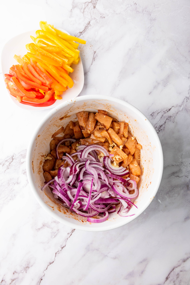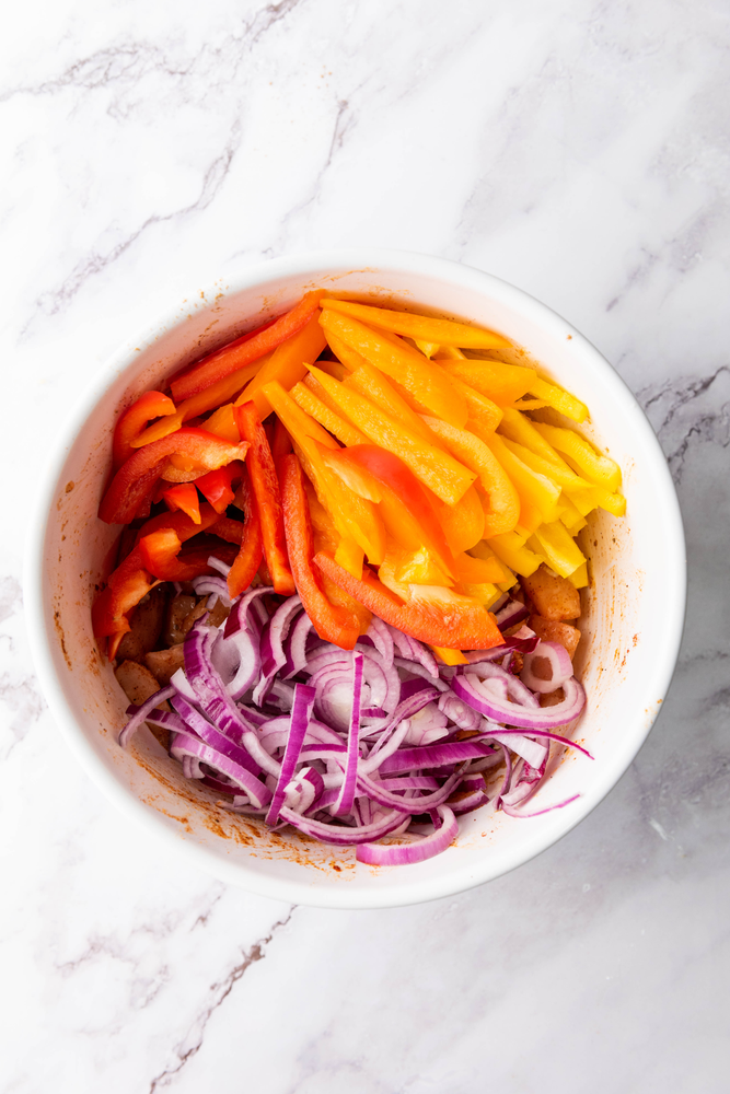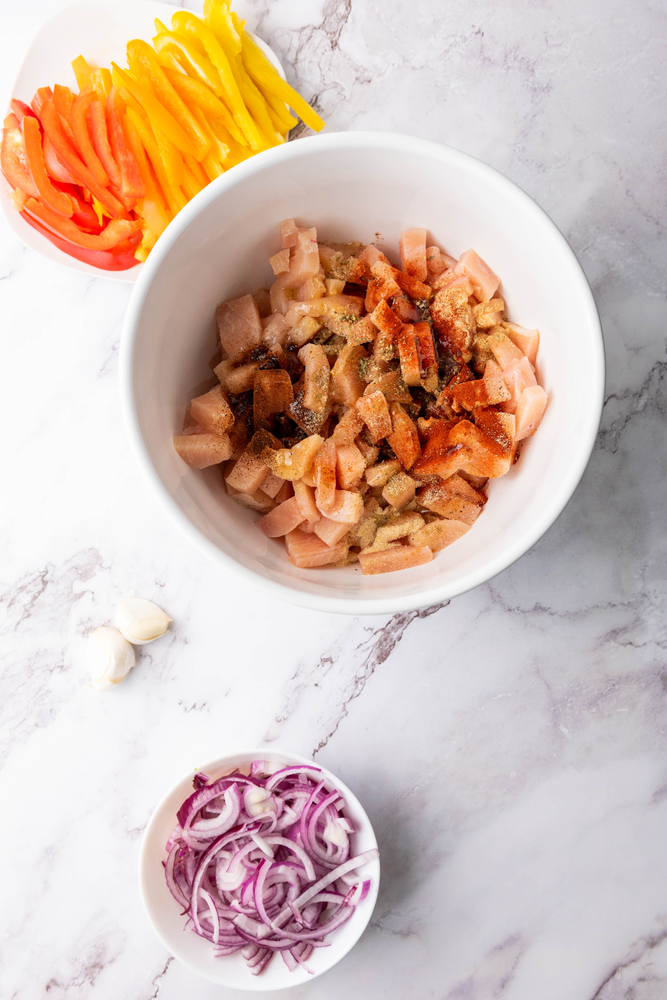 · Prepare the Chicken and Veggies: In a large mixing bowl, add the diced chicken, olive oil, paprika, garlic powder, onion powder, Mexican chili powder, dried oregano, cumin, salt, and black pepper to the bowl. Mix until well combined. Then add the minced garlic, sliced red, yellow, and orange bell peppers, and sliced red onion. Mix everything together until the chicken and veggies are evenly coated with the spices and oil.