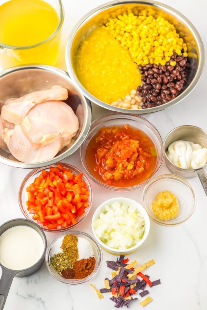 - Add the Liquid Components: Pour in the tomatoes with green chilies, chicken broth, navy beans, black beans, and both types of corn.