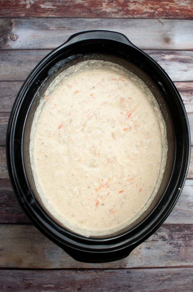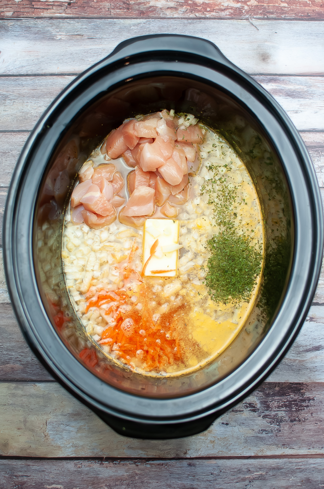 Place the butter, onion, garlic, parsley, carrots, and chicken to the slow cooker.