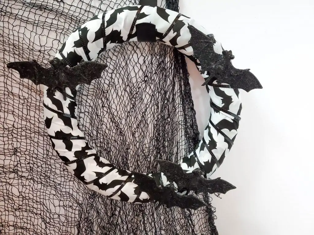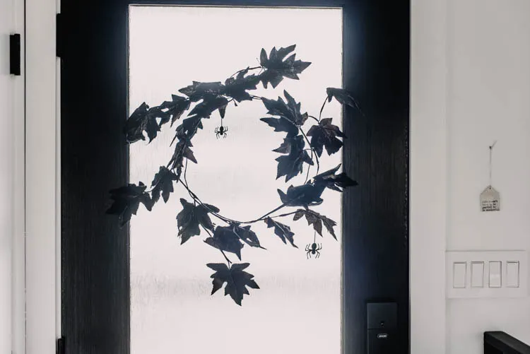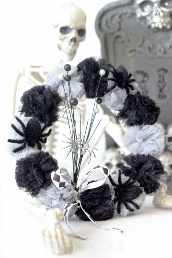 This wreath is black and white, and stunning for Halloween. Clip on a few spiders to give it the perfect creepy look without being too much!