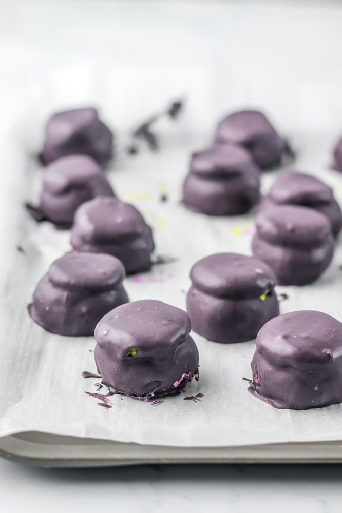 10. Carefully dip each cauldron in the black chocolate and set on the parchment paper lined tray to set.