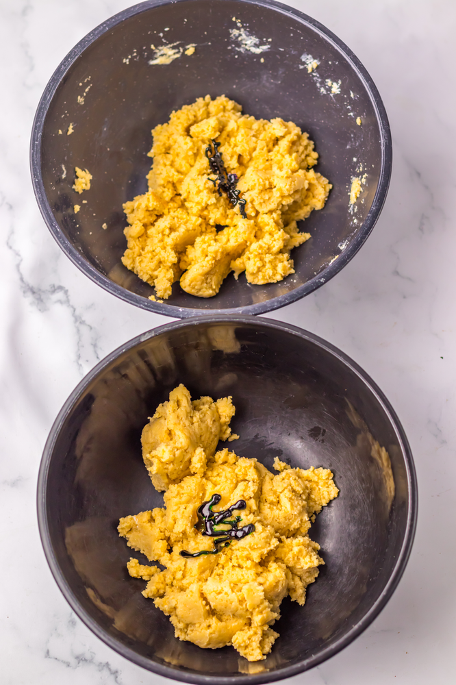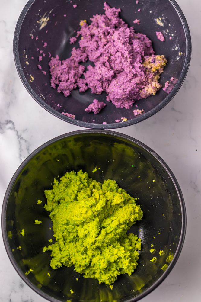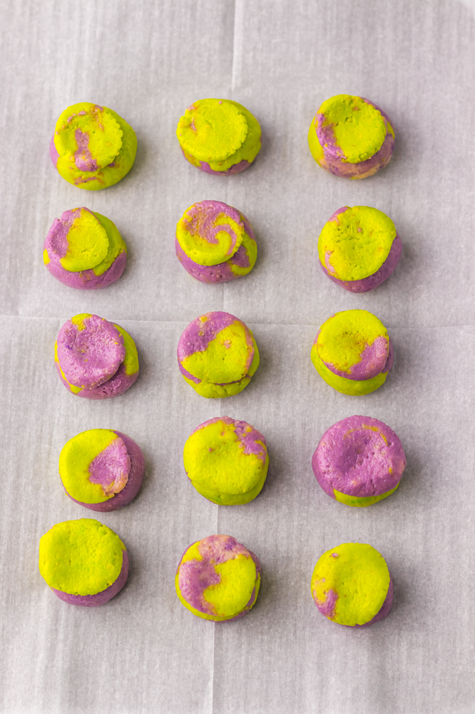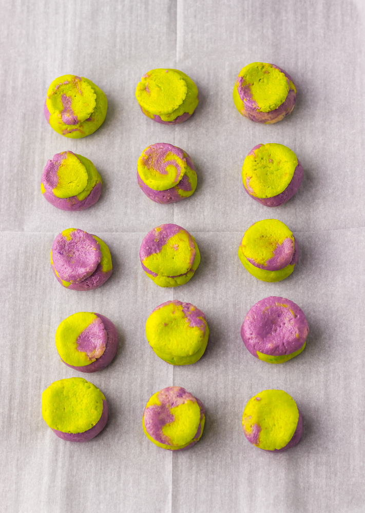 5. Take a teaspoon of each color and roll into a ball gently swirling the colors. Take about ½ teaspoon of the filling and roll into a ball and flatten.