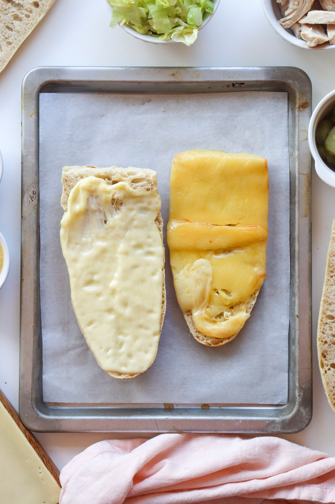 4. Toast the baguette in the oven for 5 minutes, or until the cheese is melted.