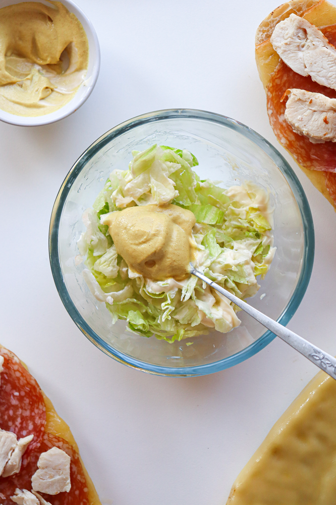 7. In a bowl, mix 1 cup of shredded iceberg lettuce with 2 tbsp of mayonnaise and 2 tbsp of mustard to make a slaw.
