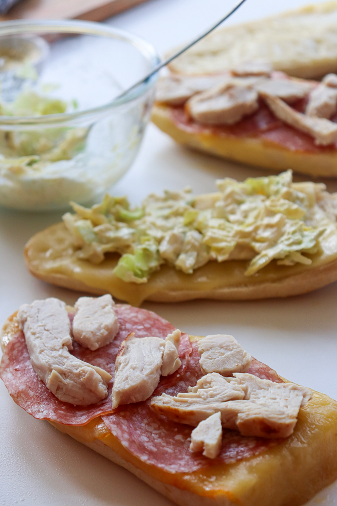 5. Layer 3-4 slices of salami on top of the melted cheese on one side of the baguette.