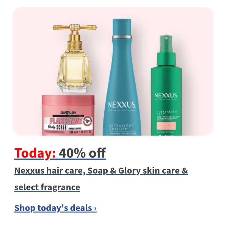 Today's 7 Days of Beauty deal is 40% off Nexxus Hair Care, Soap & Glory skin care and select fragrances.