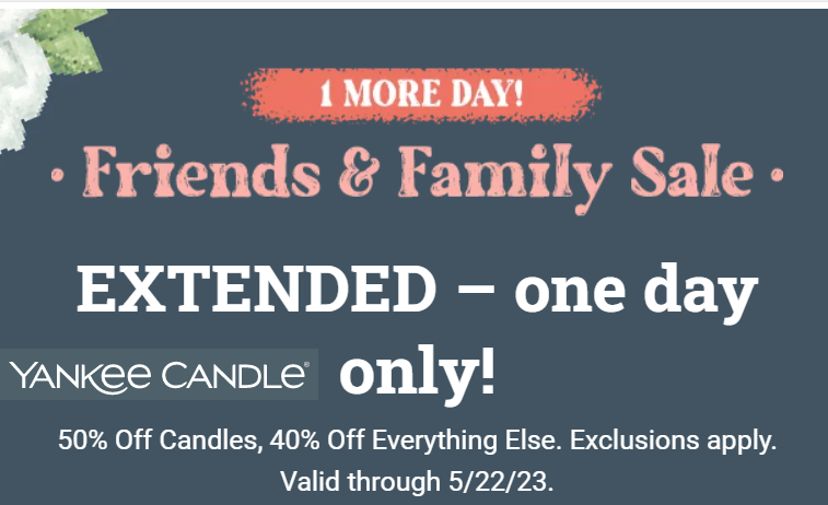Yankee Candle Friends & Family; 50% ALL CANDLES 40% off Everything Else